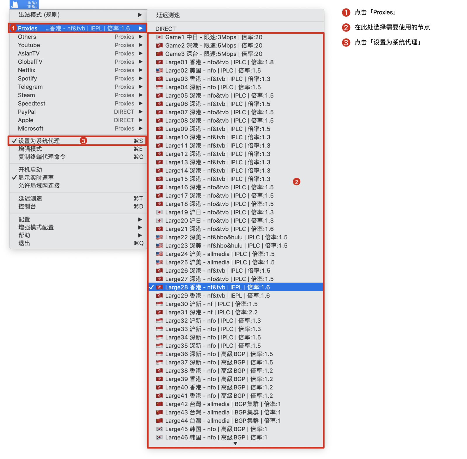 选择节点 点击 ClashX 图标 >「Proxies」或 「GLOBAL」,根据您的需求选择使用节点。
