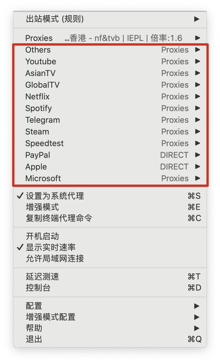 选择节点 点击 ClashX 图标 >「Proxies」或 「GLOBAL」,根据您的需求选择使用节点。